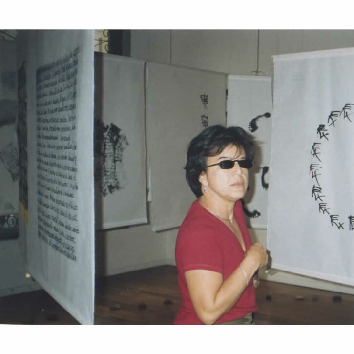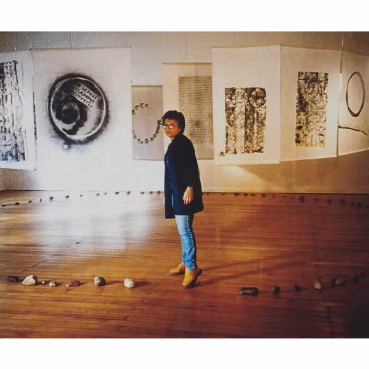 She compiles, distributes, reinvents. She traces the drawing of being on the folds of time.