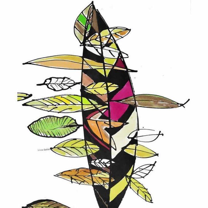 From 1990, by inner necessity e by changes on the way to be on the world, she faced, with pleasure and not without the angst inherent to challenge, the painting. In “Paisagens – Bamboos – Ilha do Mel / Landscapes – Bamboos – Ilha do Mel” (1992, she was inspired on japanese / chinese haiku poems and contemporary poets like Alice Ruiz, from bamboos on Ilha do Mel – which she uses as theme – to create her compositions that has as background very simple geometric structures that gain dynamics through poetics and colors.