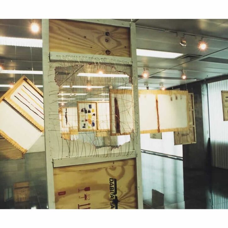 Dismantled, the wood passes to be faced on its plasticity – Gutierrez increases the potencial about it. It is almost anonymous how she puts herself in front of this newborn work and puts light layers of white, silver or red colours. Whenever possible she redirects it from corporate stamps and postmarks engraved on surfaces, trying to maintain on display, preserving the identity from old boxes.